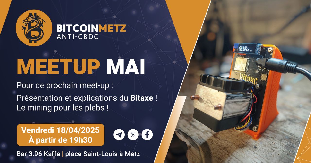 Le Bitaxe est un petit mineur ASIC autonome, open hardware et open source, conçu pour rendre le minage accessible à tous. Que vous soyez curieux, bidouilleur, ou passionné de souveraineté énergétique et technologique, ce meetup est fait pour vous.
